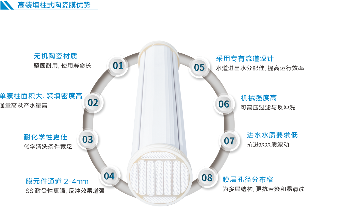 久吾高裝填柱式陶瓷膜是在久吾傳統(tǒng)管式陶瓷膜及平板式陶瓷膜技術(shù)基礎(chǔ)上研制出的一款用于水處理的無機(jī)超濾膜。高裝填柱式陶瓷膜是采用高強(qiáng)度α-Al2O3在高溫下焙燒制成,擁有良好的耐高溫性能,抗化學(xué)腐蝕性,優(yōu)秀的機(jī)械強(qiáng)度。相對(duì)傳統(tǒng)多通道管式陶瓷膜,高裝填柱式陶瓷膜單支膜管過濾面積可達(dá) 10-25 ㎡,擁有更大的裝填密度及處理能力,能夠有效去除固體懸浮物、細(xì)菌以及膠體等物質(zhì),可應(yīng)用于民用安全用水、市政給水和廢水處理、應(yīng)急供水、水回用、工業(yè)過程廢水等多個(gè)領(lǐng)域。
